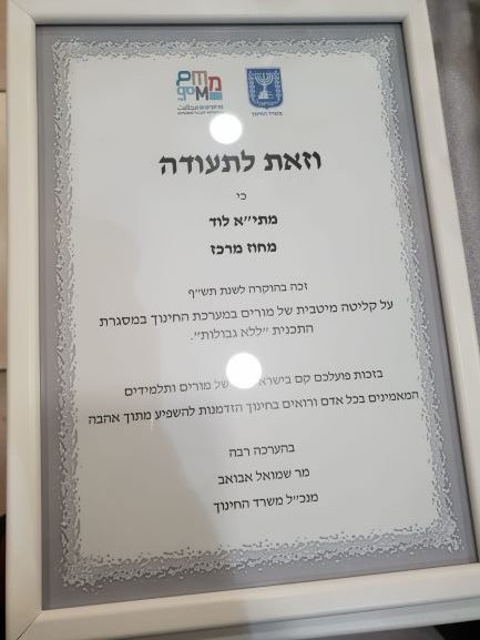 תעודת ההוקרה למתי"א לוד (צילום: דוברות משרד החינוך)