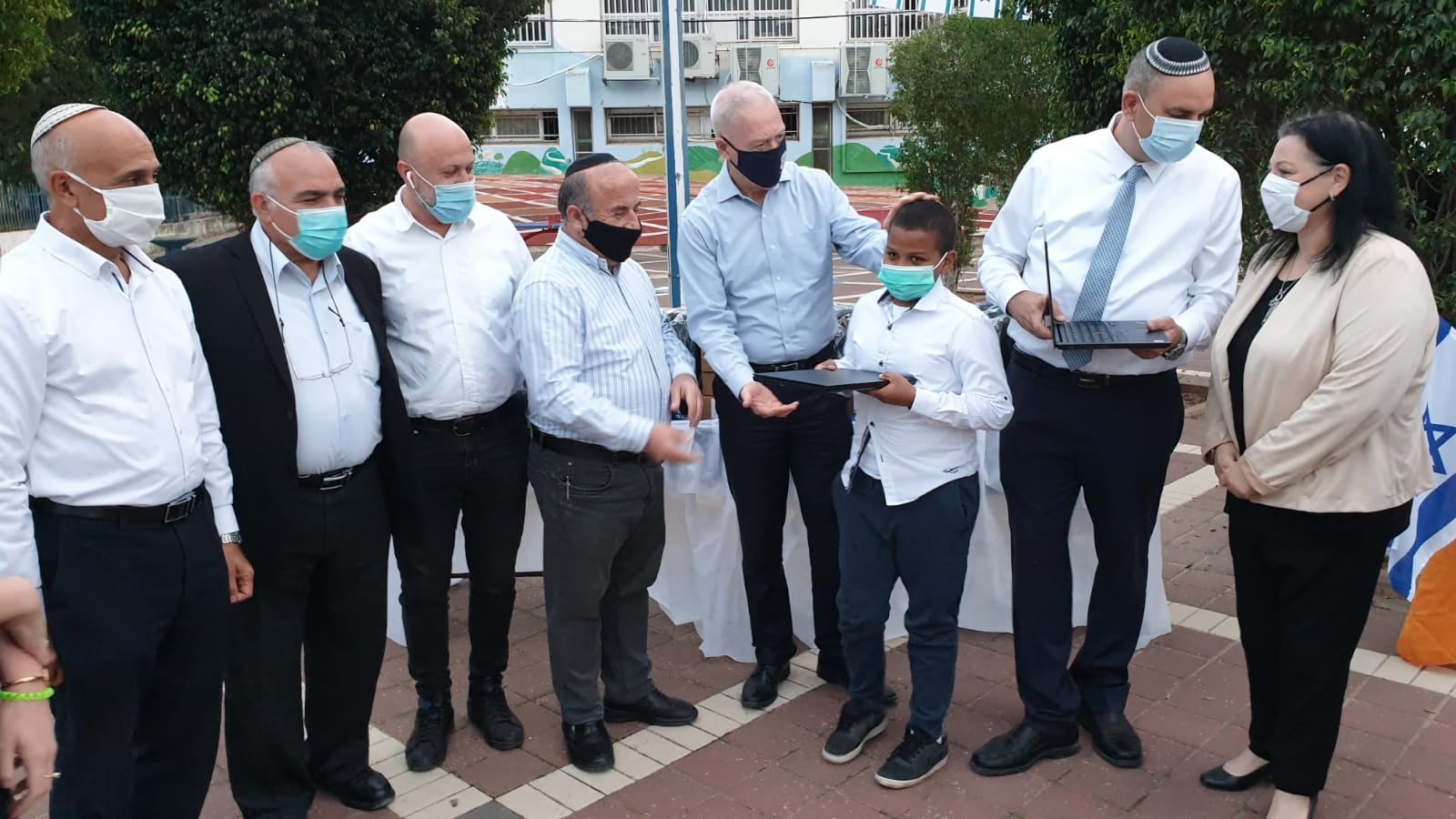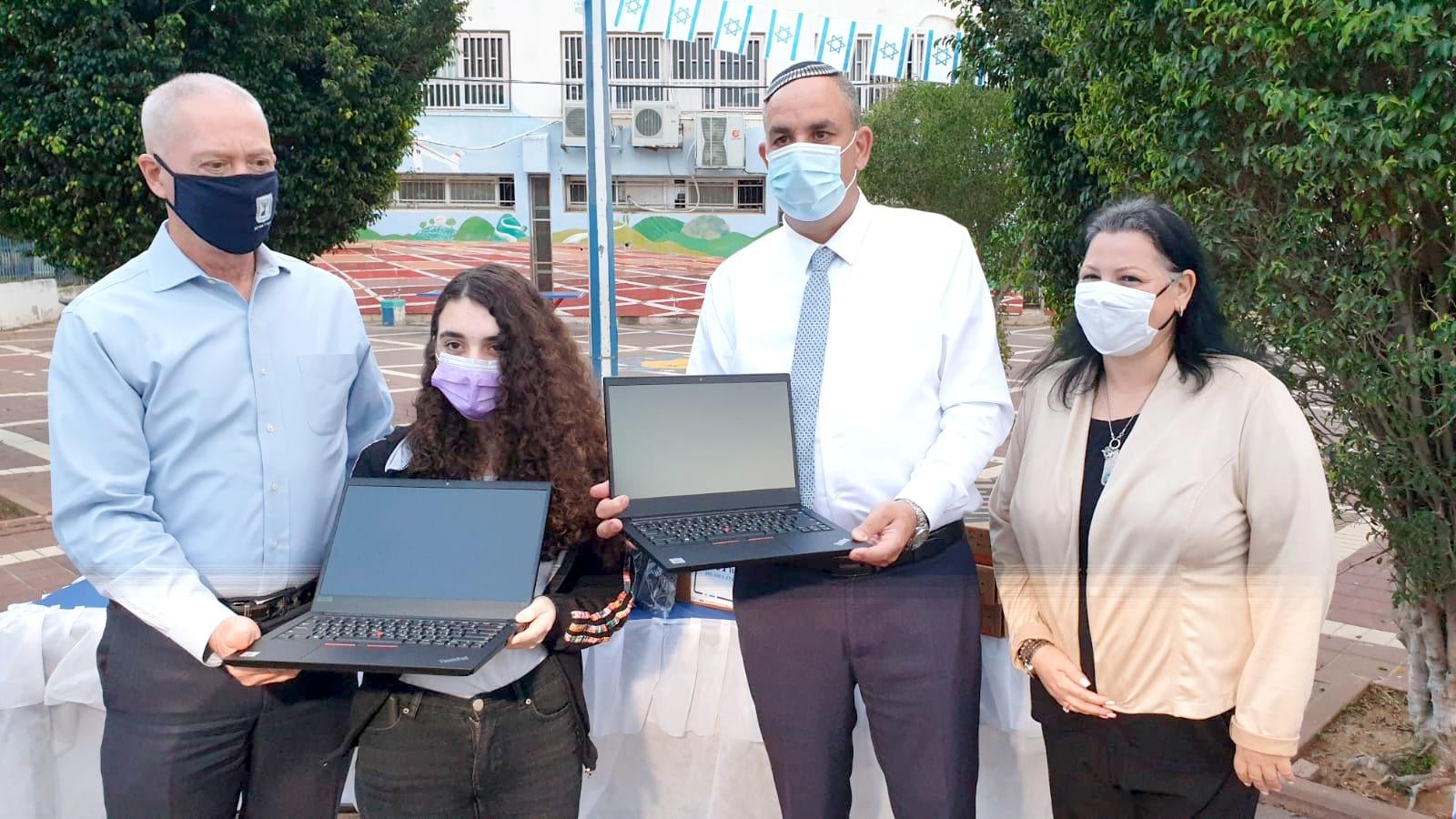 בתמונות: 1. השר גלנט, ראש העיר רביבו והמנהלת איריס עזריה מעניקים את המחשבים הניידים