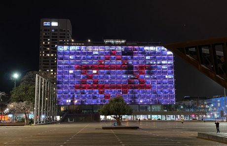 בניין עיריית תל אביב- יפו הואר ביום יום שני, 30.03.20, בסמל מגן דוד אדום (מד"א) כאות הוקרת תודה והזדהות עם